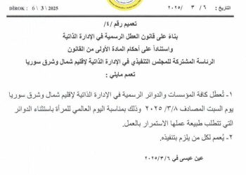 2-يُمنع التجوال بالدراجات النارية، بما في ذلك الدراجات النارية العسكرية، من الساعة ٦:٠٠ مساءً يوم الأربعاء الموافق ١٩ من آذار/مارس ٢٠٢٥ حتى الساعة ٦:٠٠ صباحًا يوم السبت الموافق ٢٢ من آذار/مارس ٢٠٢٥.