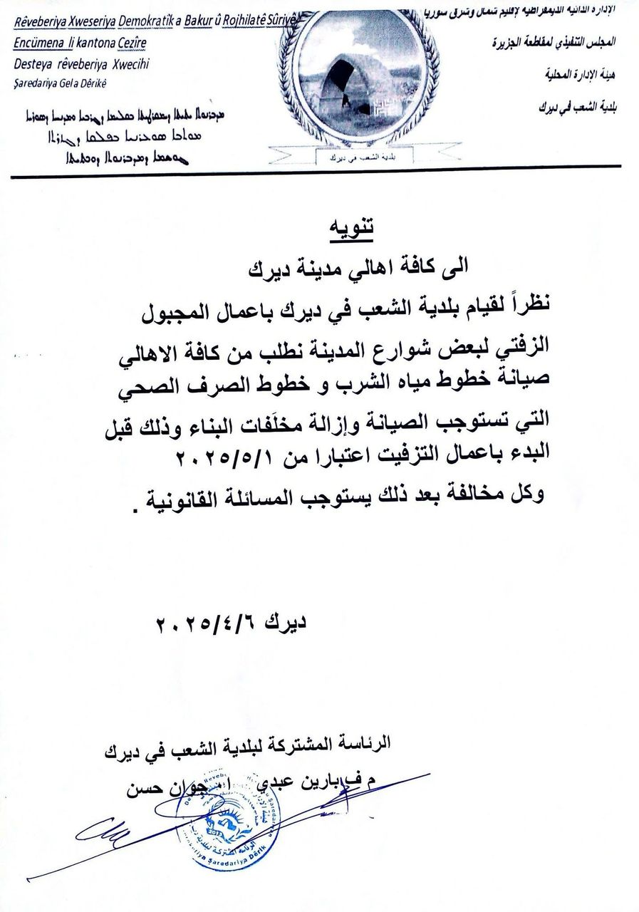 تنويه هام من بلدية الشعب في ديرك بمقاطعة الجزيرة. <img class="alignnone size-medium wp-image-11862" src="https://rxd-cezire.net/wp-content/uploads/2025/04/b529050f-8da3-4568-a44d-62f05095c3b1-210x300.jpg" alt="" width="210" height="300" />