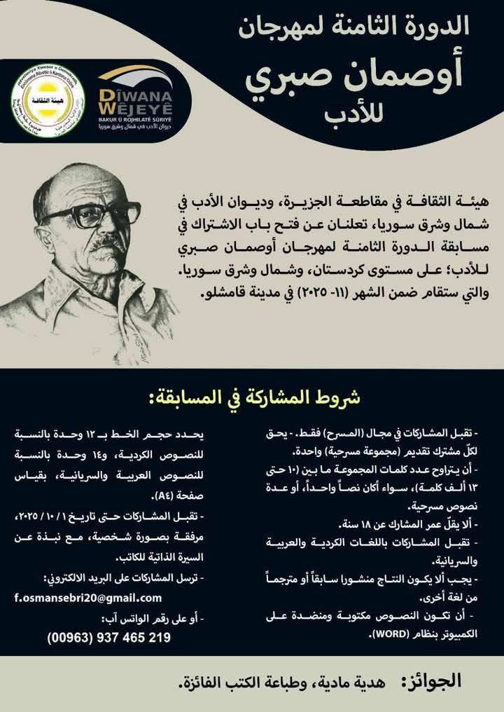 شروط المشاركة في مسابقة مهرجان أوصمان صبري للأدب بدورته الثامنة <img class="alignnone size-medium wp-image-13127" src="https://rxd-cezire.net/wp-content/uploads/2025/06/502525338_122133665090805015_948639021543602719_n-213x300.jpg" alt="" width="213" height="300" />