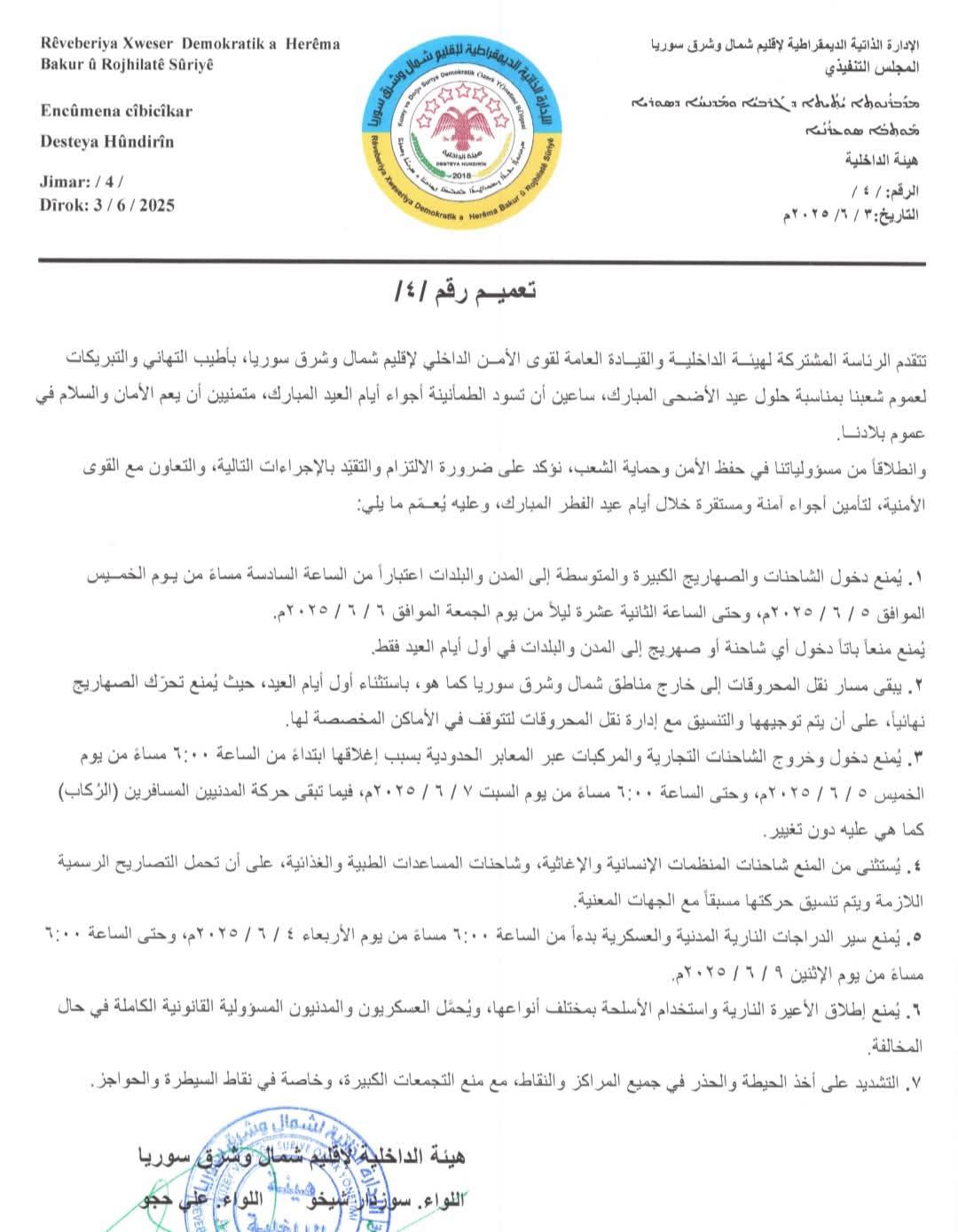 تعميم صادر عن هيئة الداخلية في إقليم شمال وشرق سوريا بخصوص عيد الأضحى المبارك <img class="alignnone size-medium wp-image-13188" src="https://rxd-cezire.net/wp-content/uploads/2025/06/493923079_122134038488805015_5507341203791412065_n-233x300.jpg" alt="" width="233" height="300" />
