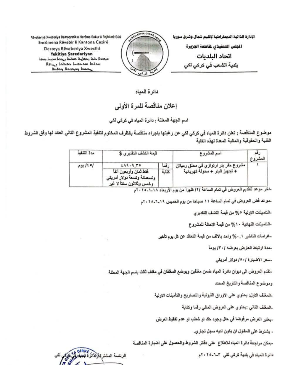 #بلدية_الشعب_في_كركي_لكي #دائرة_المياه #اعلان_مناقصة_للمرة_الأولى <img class="alignnone size-medium wp-image-13232" src="https://rxd-cezire.net/wp-content/uploads/2025/06/503864050_122134060844805015_725582530064312658_n-234x300.jpg" alt="" width="234" height="300" />