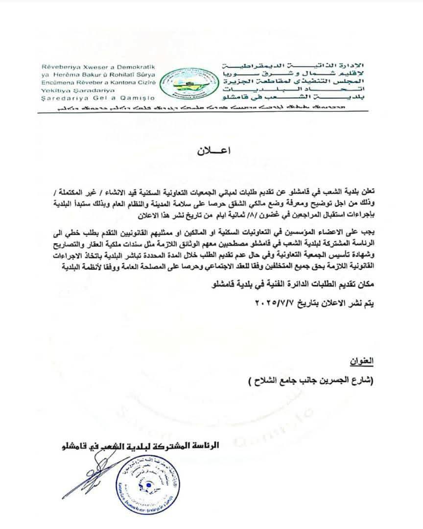 أعلنت بلدية الشعب في مدينة قامشلو، اليوم الإثنين، عن فتح باب استقبال الطلبات المتعلقة بمباني الجمعيات التعاونية السكنية التي لا تزال قيد الإنشاء، وذلك بهدف توضيح أوضاع مالكي الشقق داخل هذه المباني.
