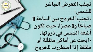 نظراً لارتفاع درجات الحرارة وحرصاً على سلامتكم، تُوصي هيئة الصحة في مقاطعة الجزيرة باتباع الإجراءات التالية خلال فترات التعرض لأشعة الشمس المرتفعة، خاصة في فصل الصيف أو عند ارتفاع درجات الحرارة: