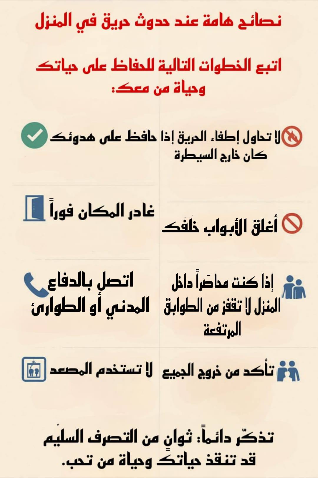 - لا تعد إلى الداخل لأي سبب، فالممتلكات يمكن تعويضها، لكن الأرواح لا تُعوّض.