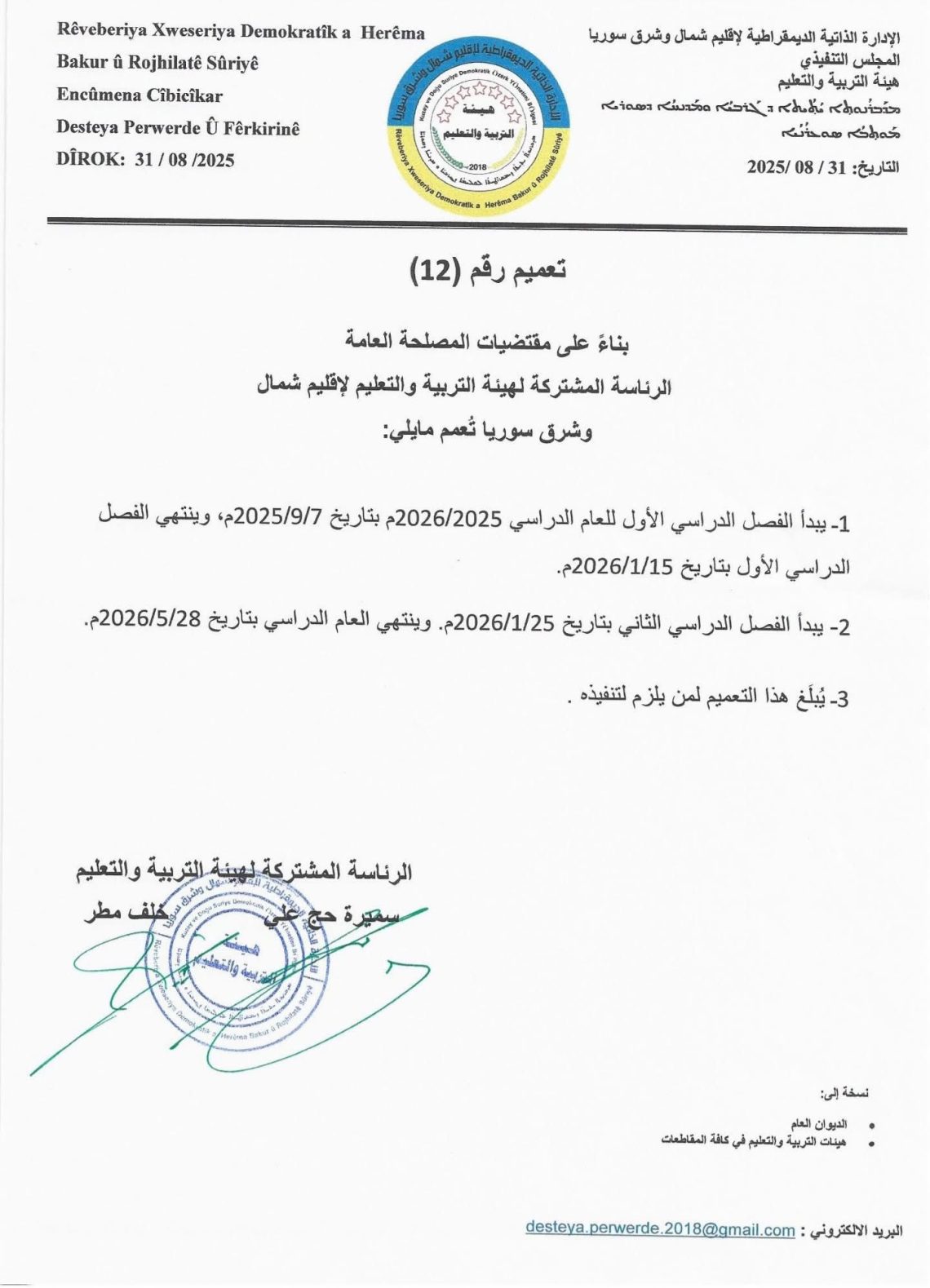 تعميم يخص العام الدراسي في شمال وشرق سوريا <img class="alignnone size-medium wp-image-15857" src="https://rxd-cezire.net/wp-content/uploads/2025/09/541202575_122147689754805015_2567861200634206291_n-217x300.jpg" alt="" width="217" height="300" />