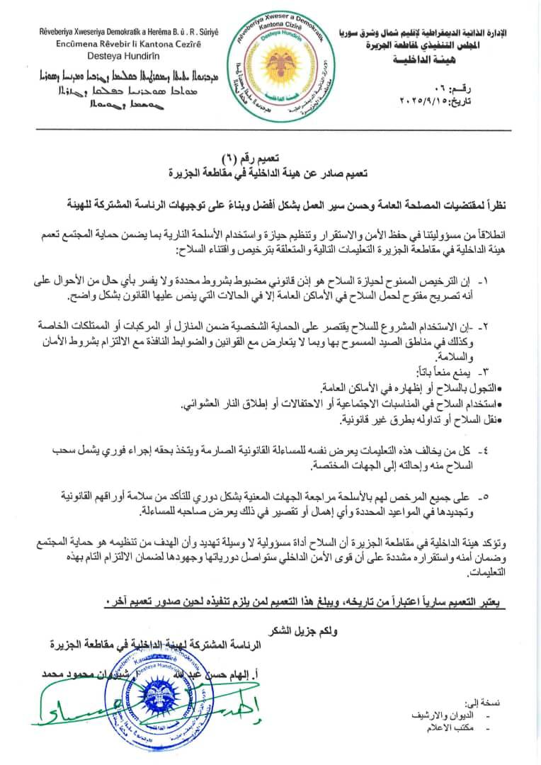 تعميم صادر عن هيئة الداخلية في مقاطعة الجزيرة يخص حيازة الأسلحة النارية <img class="alignnone size-medium wp-image-16397" src="https://rxd-cezire.net/wp-content/uploads/2025/09/547368826_122149995866805015_8835804718244194205_n-212x300.jpg" alt="" width="212" height="300" />