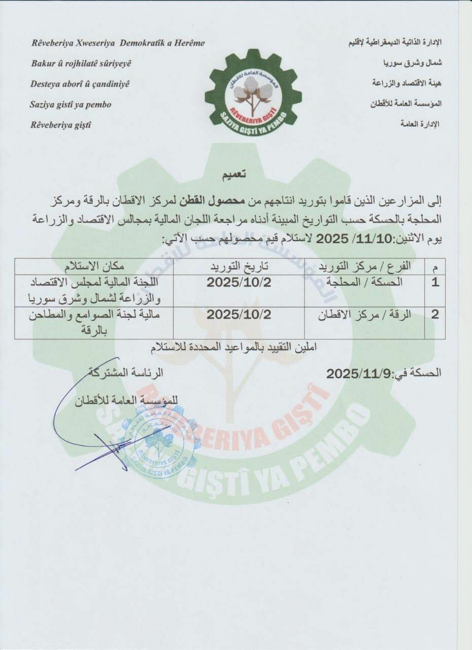 <span class="html-span xdj266r x14z9mp xat24cr x1lziwak xexx8yu xyri2b x18d9i69 x1c1uobl x1hl2dhg x16tdsg8 x1vvkbs"><a class="x1i10hfl xjbqb8w x1ejq31n x18oe1m7 x1sy0etr xstzfhl x972fbf x10w94by x1qhh985 x14e42zd x9f619 x1ypdohk xt0psk2 x3ct3a4 xdj266r x14z9mp xat24cr x1lziwak xexx8yu xyri2b x18d9i69 x1c1uobl x16tdsg8 x1hl2dhg xggy1nq x1a2a7pz xkrqix3 x1sur9pj x1fey0fg x1s688f" tabindex="0" role="link" href="https://www.facebook.com/hashtag/%D8%AA%D8%B9%D9%85%D9%8A%D9%85?__eep__=6&__cft__[0]=AZWOcsx1XX7gLcAvQ3cuWOuFegmlWRBROgjlFWoYsjQQQ4mAGV-ixTi4BaEH9ECTFG3IFYui4SJPqmXj0q0_e5Xz7v-6ue5prbIQuLggj1fwRT5uhUvpVP4RzgK7MQ-3bwqHGFUwDonvtDB2PmFXarm_&__tn__=*NK-R">#تعميم</a></span> لاستلام الأخوة المزارعين من موردي القطن لمركز الأقطان، قيم محصولهم. <img class="alignnone size-medium wp-image-18245" src="https://rxd-cezire.net/wp-content/uploads/2025/11/579885911_122157305426805015_557652528173232058_n-218x300.jpg" alt="" width="218" height="300" />