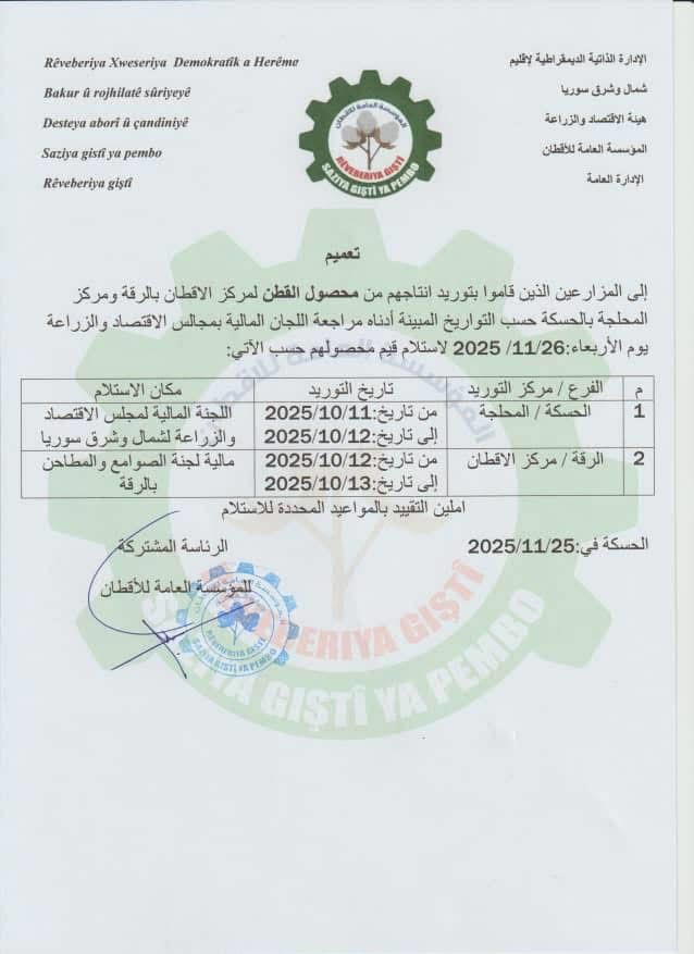 <span class="html-span xdj266r x14z9mp xat24cr x1lziwak xexx8yu xyri2b x18d9i69 x1c1uobl x1hl2dhg x16tdsg8 x1vvkbs"><a class="x1i10hfl xjbqb8w x1ejq31n x18oe1m7 x1sy0etr xstzfhl x972fbf x10w94by x1qhh985 x14e42zd x9f619 x1ypdohk xt0psk2 x3ct3a4 xdj266r x14z9mp xat24cr x1lziwak xexx8yu xyri2b x18d9i69 x1c1uobl x16tdsg8 x1hl2dhg xggy1nq x1a2a7pz xkrqix3 x1sur9pj x1fey0fg x1s688f" tabindex="0" role="link" href="https://www.facebook.com/hashtag/%D8%AA%D8%B9%D9%85%D9%8A%D9%85?__eep__=6&__cft__[0]=AZUNjaU6r1BzYh2ejUJ2fyuvzWOo--DrQQ7JQROIAqi76iHNbcjixI4DRsk-fBYe9VrGefFNKNNpS8Yyv9Bq3gVlnPZRPvZuhxsvGVrslonmc5iKohzKoC-c3GwED1GGhIGGiF1EJuwN-8vOnqQ8pJcQIdcV2GKwggyYBZkdiaQTchbXo8hNfBbpvdZ6UVtbkDnA2lHvZD4A0vQeqFS6Ml5J&__tn__=*NK-R">#تعميم</a></span> يخص الموردين لمراكز المحلج لاستلام قيم محصولهم <img class="alignnone size-medium wp-image-18718" src="https://rxd-cezire.net/wp-content/uploads/2025/11/587542389_122159287004805015_9015773058734555016_n-218x300.jpg" alt="" width="218" height="300" />
