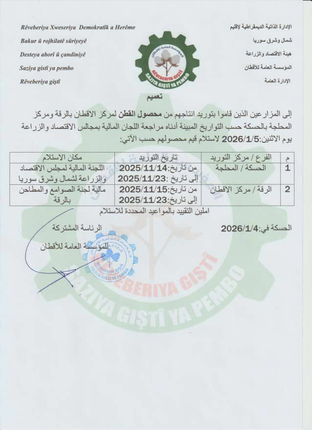 تعميم من أجل استلام الأخوة المزارعين الذين قاموا بتوريد محصول القطن لمراكز الأقطان بالحسكة والرقة لقيم محصولهم <img class="alignnone size-medium wp-image-20814" src="https://rxd-cezire.net/wp-content/uploads/2026/01/611957886_122163997142805015_4322570255260624542_n-218x300.jpg" alt="" width="218" height="300" />