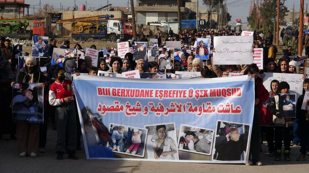 خرج العشرات من أهالي بلدة جل آغا وبمختلف مكوناتها بمسيرة داعمة لحيي الشيخ مقصود والأشرفية، وسط ترديد الشعارات التي تحي مقاومة الأهالي وتندد بالهجمات التي تشنها قوات الحكومة المؤقتة.