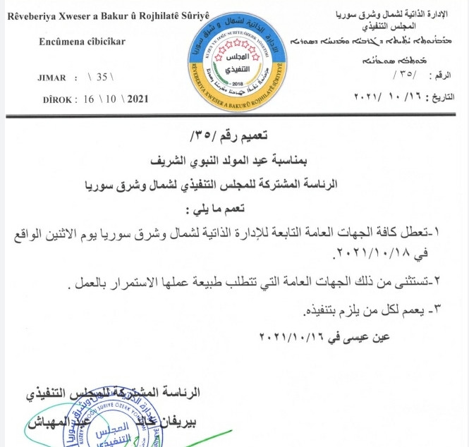 1- تعطل كافة الجهات العامة للإدارة الذاتية لشمال وشرق سوريا يوم الأثنين الواقع في 18/10/2021.