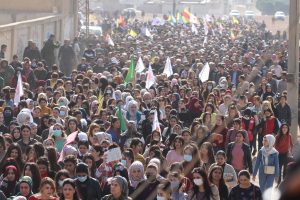مظاهرة حاشدة انطلقت صباح اليوم الأربعاء المصادف في 10/11/2021 في مدينة قامشلو منددة بالمجزرة التي استهدفت ثلاث مواطنين مدنيين من العائلة الوطنية ” عائلة كلو ” حيث شارك الآلاف من المواطنين والعاملين في مؤسسات الإدارة الذاتية .