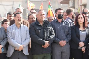 واختتم ” يونس ” كلمته بالقول : من هذا المنبر منبر العزة والكرامة نوجه رسالة للدولة التركية الفاشية بأن شعوب المنطقة وبجميع مكوناته سائرون على درب الشهداء حتى تحرير كل شبر من الاحتلال التركي ومرتزقته ونعاهد على ان نبقى على هذا النهج ونقد كل ما لدينا في سبيل إنجاح مشروع الامة الديمقراطية ، كما قدم التعازي الحارة لعائلة الشهداء .