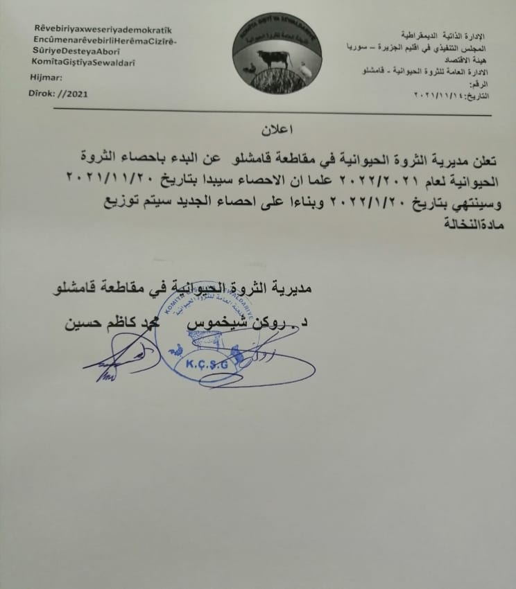 تعلن مديرية الثروة الحيوانية في مقاطعة قامشلو عن البدء بإحصاء الثروة الحيوانية لعام 2021 / 2022 .