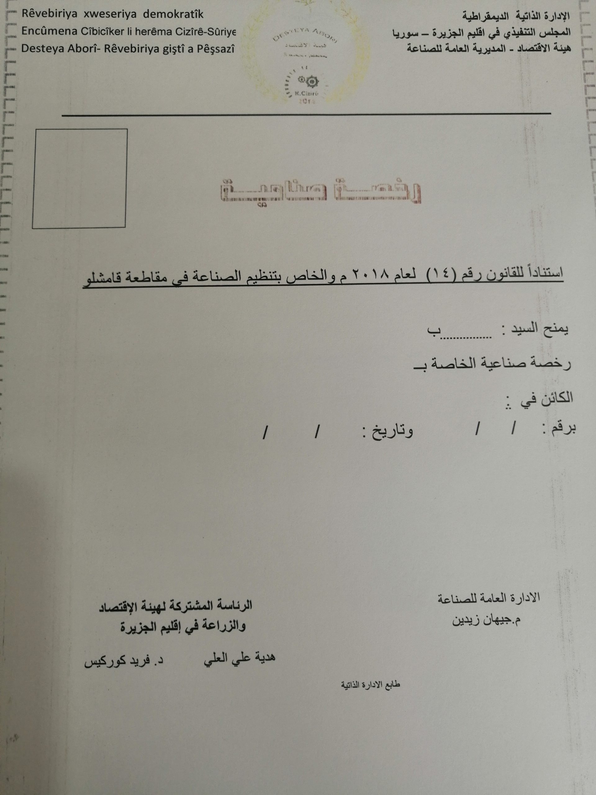 تقوم المديرية العامة للصناعة في مقاطعة قامشلو بترخيص المعامل والاشراف عليها ومتابعة عملها والمناقشة مع أصحابها حول المشاكل والصعوبات التي تواجههم وتقديم كافة التسهيلات الممكنة لهم.