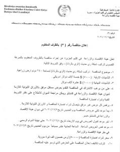 - موعد فض العروض الساعة: الساعة الحادية عشر صباحاً من يوم الخميس تاريخ 9/12/2021 في مقر هيئة الاقتصاد والزراعة.