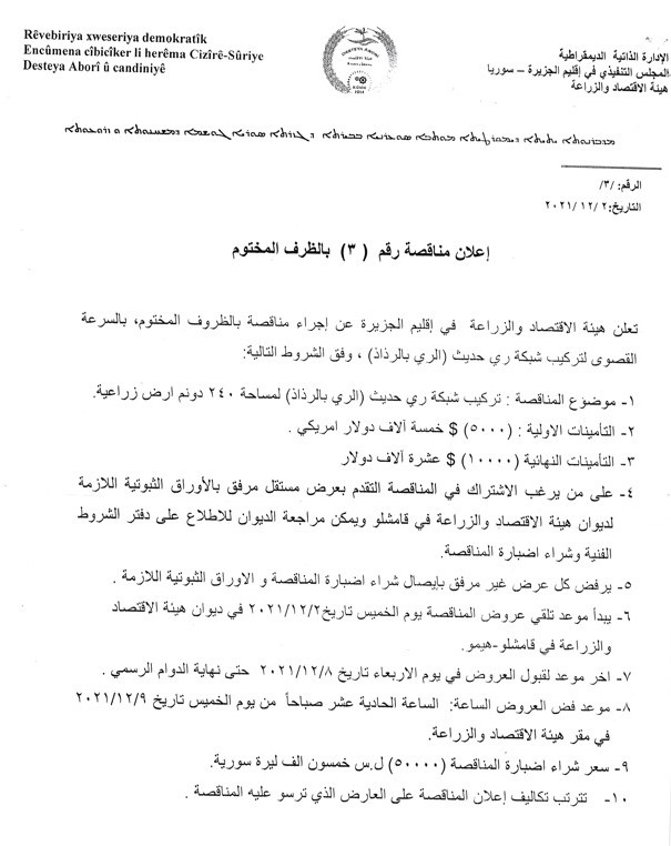 - يبدأ موعد تلقي عروض المناقصة يوم الخميس تاريخ2/12/2021 في ديوان هيئة الاقتصاد والزراعة في قامشلو – هيمو.
