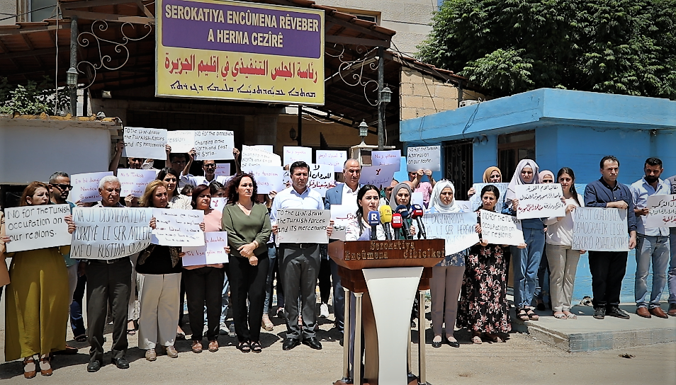 وندعو كل القوى والفعاليات السورية والسلطة في دمشق بالقيام بمسؤولياتها تجاه سياسات الاحتلال التركي وتهديداته بقضم أجزاء أخرى من الأراضي السورية .