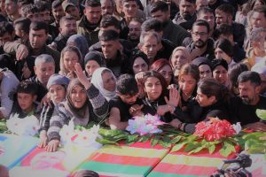 شارك وفد من الإدارة الذاتية الديمقراطية لإقليم الجزيرة اليوم الاثنين في مراسيم تشيع ١١ شهيداً من مدينة ديريك والذين استشهدوا بتاريخ 19-20 من الشهر الجاري نتيجة استهداف للاحتلال التركي.