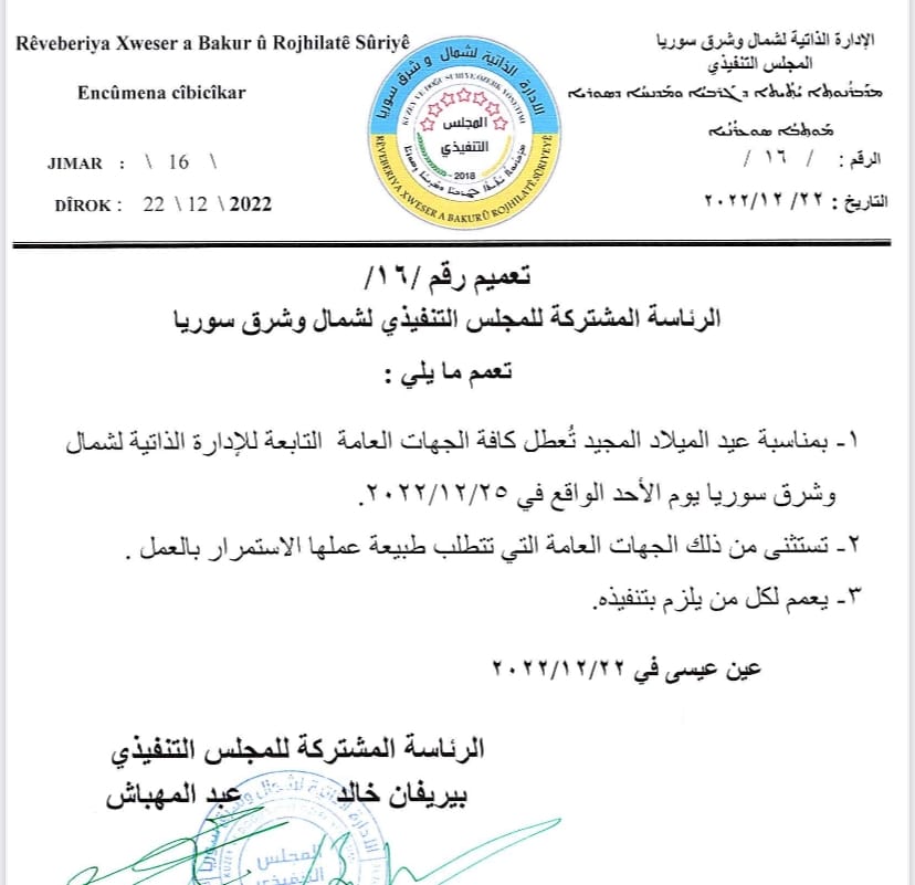تعطل كافة الجهات العامة التابعة للإدارة الذاتية لشمال وشرق سوريا يوم الاحد الواقع ٢٠٢٢/١٢/٢٥ بمناسبة عيدالميلاد المجيد. <img class="alignnone size-medium wp-image-6570" src="https://rxd-cezire.net/wp-content/uploads/2022/12/تعميم-300x290.jpg" alt="" width="300" height="290" />