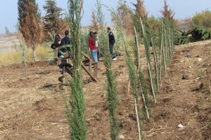 وبدأت المرحلة الأولى بزراعة الأشجار, هي من الأنواع التالية “زيتون وسرو عمودي”، كما تم تزويد موقع المشروع بكافة المستلزمات.