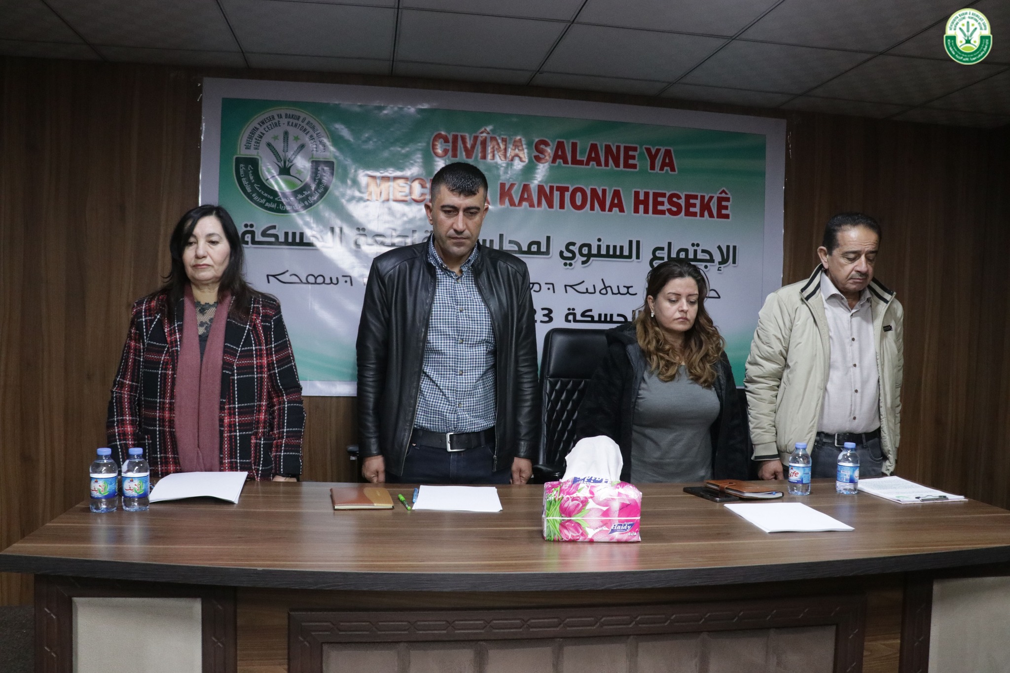 بدأ الاجتماع بالوقوف دقيقة صمت اجلالا لأرواح الشهداء ، وتلاها القاء الكلمة الافتتاحية من قبل الرئاسة المشتركة لمجلس مقاطعة الحسكة ” خبات سليمان ” ، حيث رحب وبارك انعقاد هذا الاجتماع السنوي للمجلس على جميع الحضور ، وشرح بنود الاجتماع الموجود في التقرير السنوي .