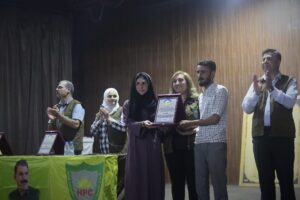 ونظمت مراسم التكريم من قبل الإدارة الذاتية لمقاطعة الجزيرة في قاعة مركز سردم للثقافة والفن في مدينة الحسكة، بحضور العشرات من أعضاء قوات حماية المجتمع والهيئة الرئاسية للمجلس التنفيذي في مقاطعة الجزيرة ومستشارة الإدارة الذاتية في مقاطعة الجزيرة السيدة شهناز.