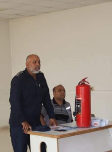تم خلال القسم النظري من الحملة شرح انواع الحرائق وكيفية التعامل مع كل نوع وكذلك شرح المواد الداخلة في عملية الإطفاء (جهاز الاطفاء بالبودرة الكيميائية).