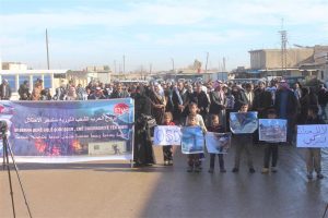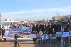 وشارك في المسيرة المئات من أهالي المدنية والقرى المجاورة وأعضاء المؤسسات المدنية والأحزاب السياسية وشيوخ ووجهاء العشائر العربية رافعين يافطات كتب عليها (لا للتهجير القسري ، لا للعدوان التركي، كلنا قسد ).