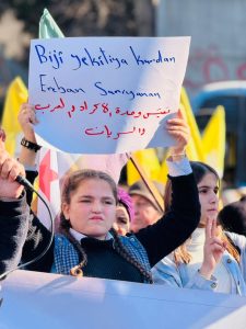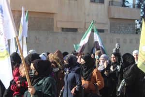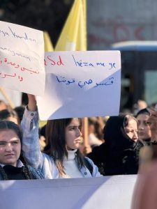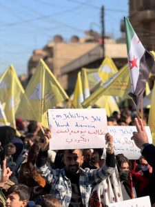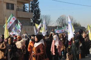 وخلال هذه المسيرات، رُفعت علمي الإدارة الذاتية الديمقراطية لإقليم شمال وشرق سوريا وقسد، بالأضافةإلى علم الاستقلال.
