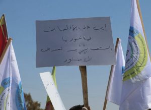 Bi hezaran şêneyên bajarê Hesekê bi hemû pêkhateyên wê, saziyên Rêveberiya Xweser, partiyên siyasî û rêxistinên jinan, beşdarî xwepêşandanekê bûn ku tê de destûra nû ya Sûriyê şermezar kirin, li pêşiya baregeha hevpeymaniya navdewletî li rojavayê bajarê Hesekê.