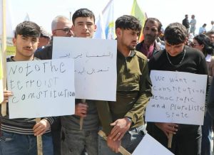 Xwepêşandana şandeke ku ji nûnerên Kurd, Ereb, Suryan û Ermenî pêk dihat,û ketin nav baregeha Hevpeymaniya Navdewletî û daxwaznameyeke nerazîbûnê pêşkêşî redkirina daxuyaniya destûrî kirin.