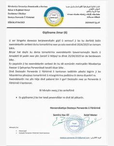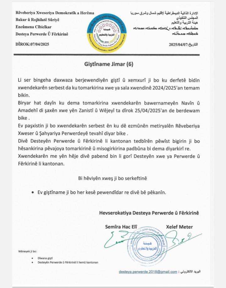 Rêveberiya Perwerdeyê biryar da ku dema tomarkirina xwendekarên azadîxwaz ji bo sala sêyem ya dibistana navîn û sala sêyem ya dibistana navîn ji bo sala xwendinê 2024/2025 li şaxên xwe yên zanistî û wêjeyî heta roja 25/4/2025 dirêj bike