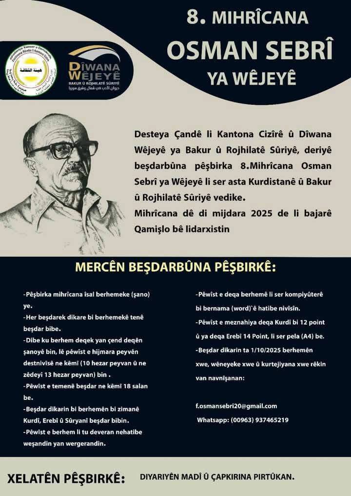 Mercên beşdarbûna festîvala Osman Sebrî a wêjeyî bi dewreya xwe ya heştemîn <img class="alignnone size-medium wp-image-12858" src="https://rxd-cezire.net/ku/wp-content/uploads/2025/06/502491332_122133665132805015_1918184736756432813_n-213x300.jpg" alt="" width="213" height="300" />