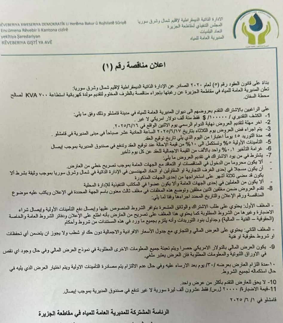 Midûriyeta Avê Îhaleya Hejmara (1) ya peydakirina jeneratora 700 KVA ji bo Îstasyona El-Safan eşkere dike. <img class="alignnone size-medium wp-image-12862" src="https://rxd-cezire.net/ku/wp-content/uploads/2025/06/501785390_122133529322805015_6708340962981432933_n-263x300.jpg" alt="" width="263" height="300" />