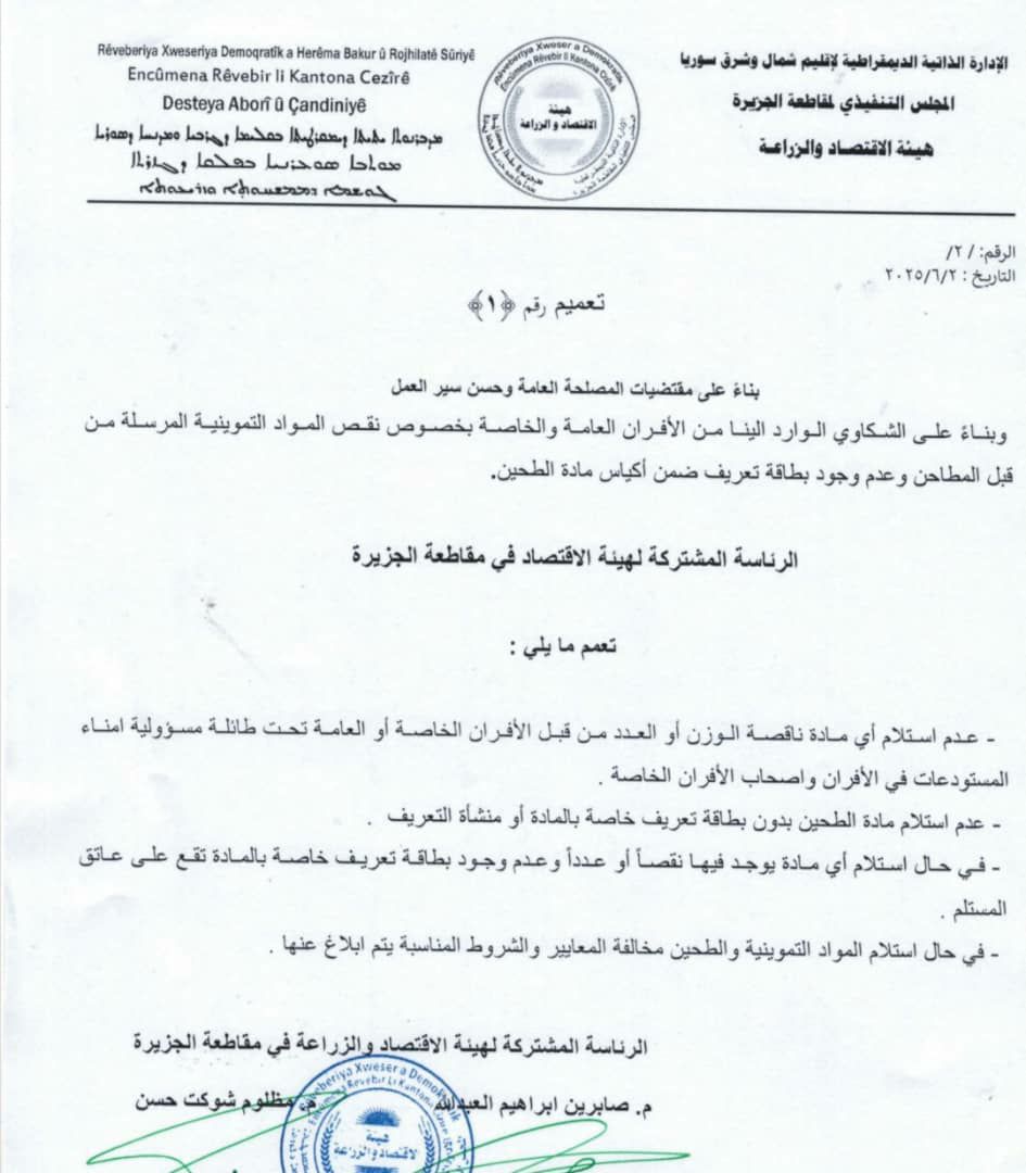 Li ser bingeha daxwazên berjewendiya giştî û birêvebirina karê baş û li ser bingeha giliyên ku me ji nanpêjxaneyên giştî û taybet di derbarê kêmbûna pêdiviyên xwarinê yên ji hêla aşxaneyan ve hatine şandin, û nebûna kerta nasnameyê li ser kîsên nan,serokatiya hevbeş a Desteya Aborî li Kantona Cezîrê ev giştîkirin derxist:
