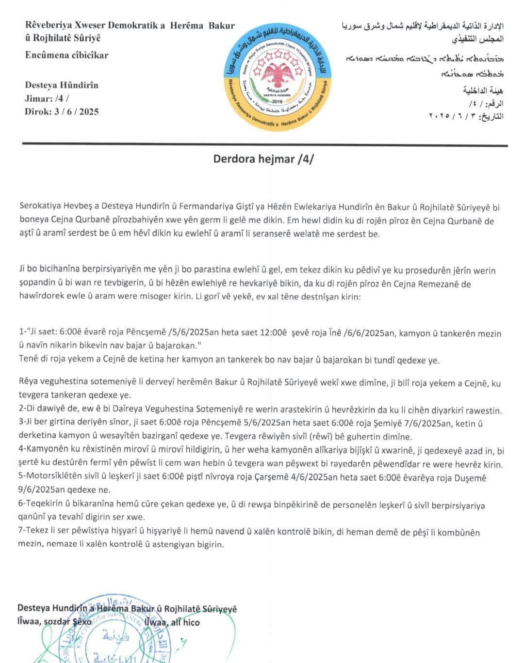 Desteya Hundirîn a Herêma Bakur û Rojhilatê Sûriyeyê di derbarê Cejna Qurbanê de biryarnameyek derxist <img class="alignnone size-medium wp-image-12910" src="https://rxd-cezire.net/ku/wp-content/uploads/2025/06/502912027_122134041206805015_8180751363308305758_n-237x300.jpg" alt="" width="237" height="300" />
