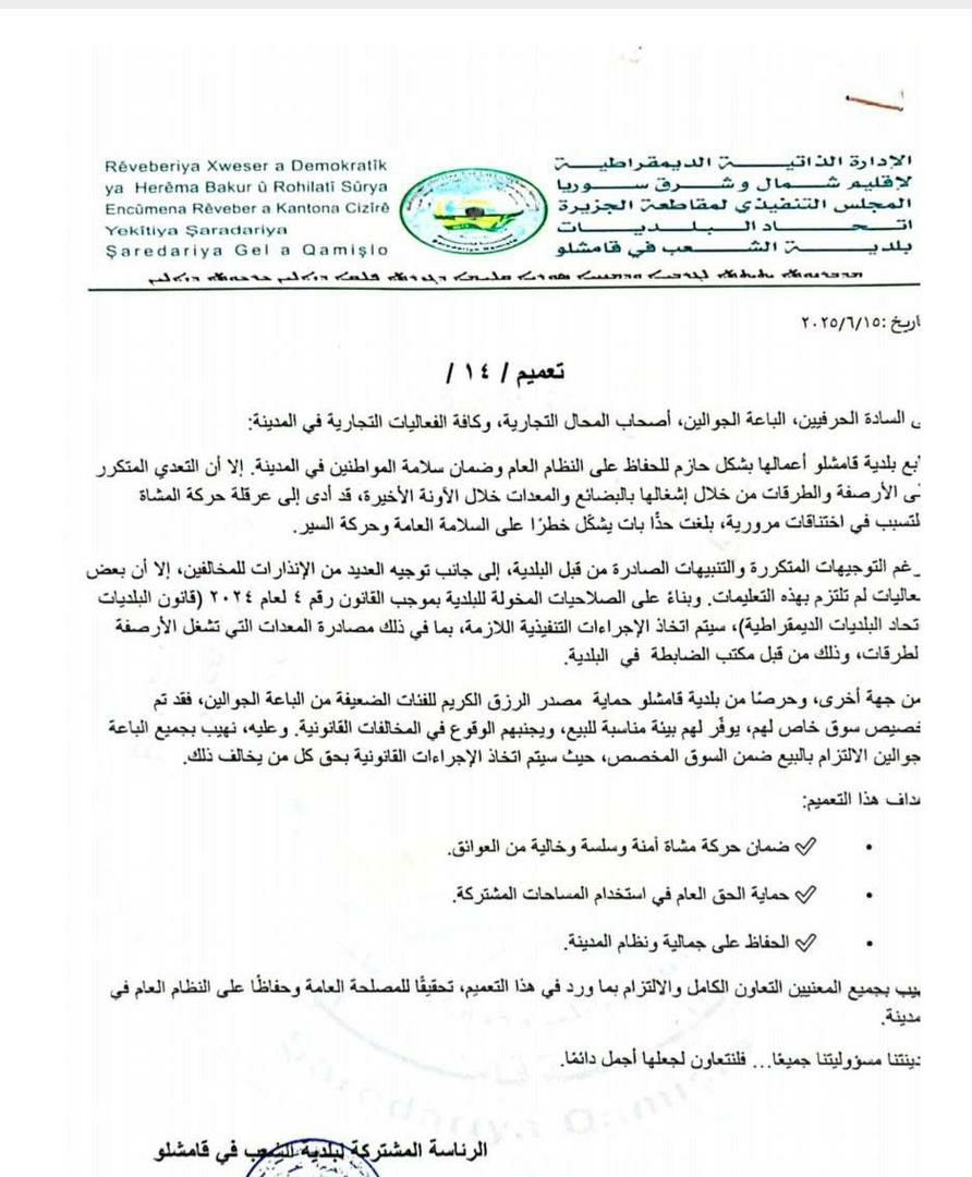 Ji aliyê din ve, û ji bo parastina debara firoşkarên kolanan ên bêparastin, Şaredariya Qamişlo ji bo wan bazarek taybetî destnîşan kiriye, ji bo ku ji wan re hawîrdorek firotanê ya guncaw peyda bike û ji binpêkirinên yasayî dûr bisekine. Li gorî vê yekê, em bang li hemû firoşkarên kolanan dikin ku pabend bibin ku di nav bazara diyarkirî de bifroşin, ji ber ku li dijî her kesê ku vê yekê binpê bike, dê tedbîrên qanûnî werin girtin.