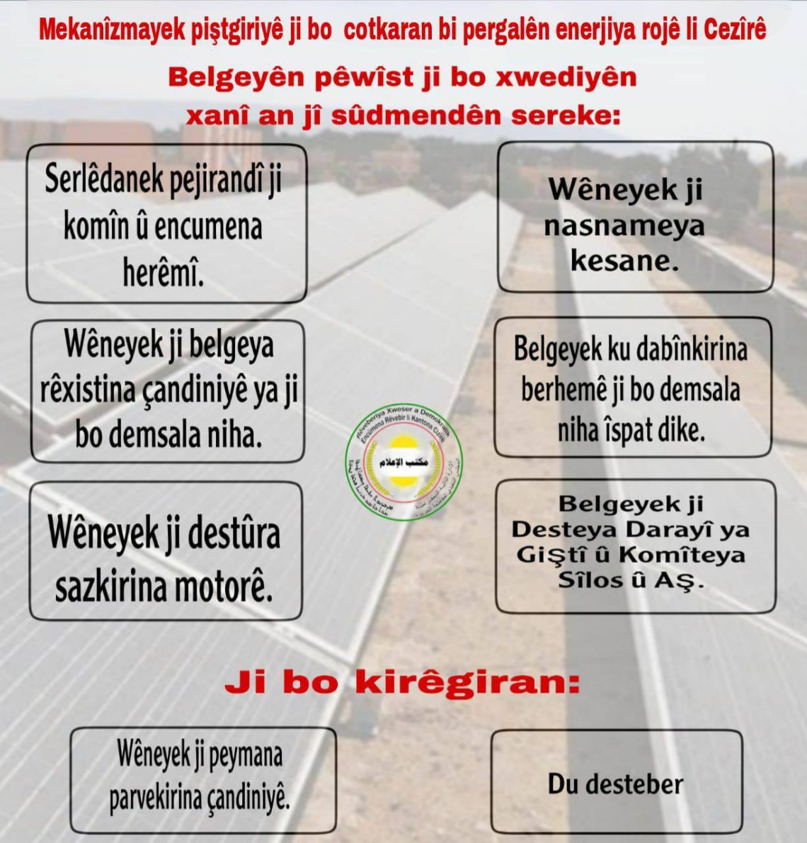 Mekanîzmayek piştgiriyê ji bo cotkaran bi pergalên enerjiya rojê li Cezîrê <img class="alignnone size-medium wp-image-14874" src="https://rxd-cezire.net/ku/wp-content/uploads/2025/08/535059105_122145796394805015_1445912988805930164_n-287x300.jpg" alt="" width="287" height="300" />