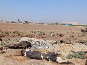 Gel bi ofîsa tendrustiyê ya şaredariya gel a bajarê Qamişlo re têkilî kirin û gazin kirin ku gelek lawirên mirî (mî, golik û çêlek) li ser rêya çandiniyê ya gundê Um el_Firsan hatine avêtin.