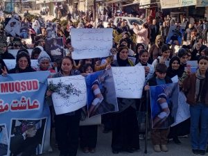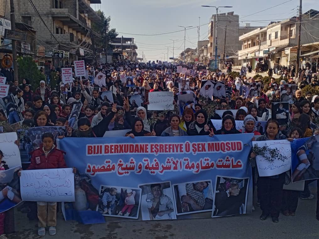 Bi sedan şêniyên bajarê Girkê Legê û gundewarên wê li kantona Cizîrê, bi meşeke girseyî piştgiriya xwe ji bo berxwedana taxên Şêx Meqsûd û Eşrefiyê nîşan dan. Di meşê de, topbarana hêzên “Hikûmeta Demkî” ya li ser her du taxan û armanckirina rasterast a sivîlan şermezarkirin.