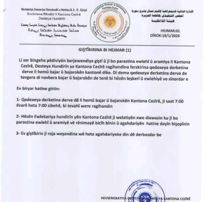 <div class="x14z9mp xat24cr x1lziwak x1vvkbs xtlvy1s x126k92a"> <div dir="auto"></div> </div> <div class="x14z9mp xat24cr x1lziwak x1vvkbs xtlvy1s x126k92a"> <div dir="auto">Ji bo parastina aramî û ewlehiyê, qedexeya derketina derve ji demjimêr 07:00’ê êvarê heta demjimêr 07:00’ê sibehê berdewam dike.</div> </div> <div class="x14z9mp xat24cr x1lziwak x1vvkbs xtlvy1s x126k92a"> <div dir="auto">Pabendbûna we bi demjimêrên qedexeyê, misogeriya ewlehiya herêmê ye.</div> </div> <div class="x14z9mp xat24cr x1lziwak x1vvkbs xtlvy1s x126k92a"> <div dir="auto">Desteya Hundirîn a Kantona Cizîrê 19.01.2026</div> <div dir="auto"><img class="alignnone size-medium wp-image-20125" src="https://rxd-cezire.net/ku/wp-content/uploads/2026/01/618367758_122165707508805015_174844559504668567_n-300x296.jpg" alt="" width="300" height="296" /></div> </div>